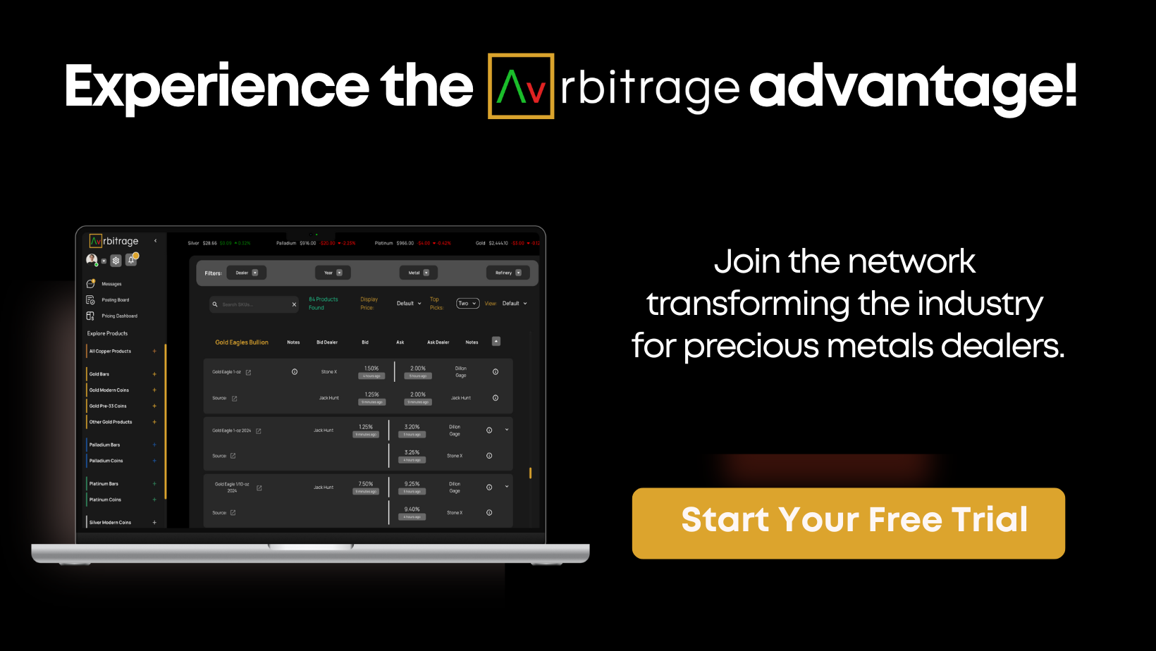 The group of dealers below provide the best prices on over 700 products on a daily basis. Whether you deal with some or all of them, viewing their pricing on Aurbitrage ensures you get the full view of the market, giving you negotiation power wherever you take your business.
